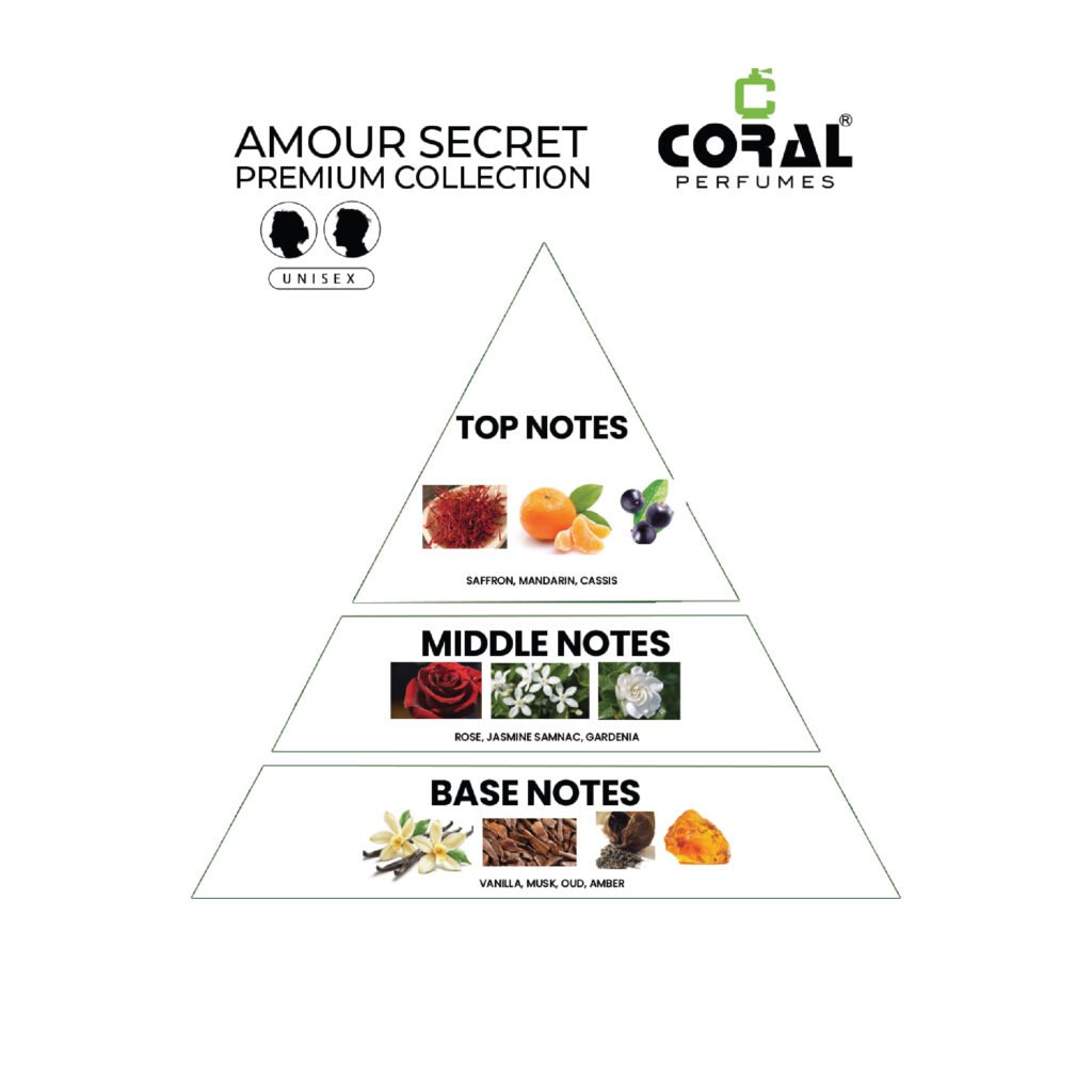 Coral Amour Secret is a sophisticated and luxurious fragrance with a beautifully balanced combination of fruity, floral, and woody notes. The opening is vibrant and sparkling with citrus and fruit, transitioning into a rich, romantic floral heart. The base is warm and sensual, with a deep, luxurious finish that includes the richness of oud, amber, and musk. This fragrance is perfect for those who enjoy oriental-floral perfumes with a modern twist, offering both freshness and depth, making it ideal for evening wear or special occasions.
