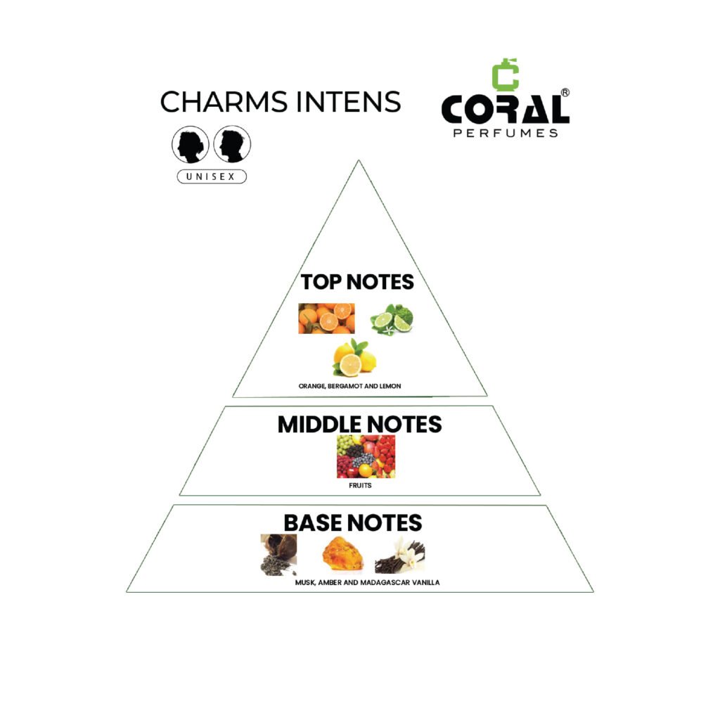 * Charms Intense opens with a burst of fresh citrus notes, including vibrant bergamot and zesty lemon, creating an invigorating and uplifting aura.