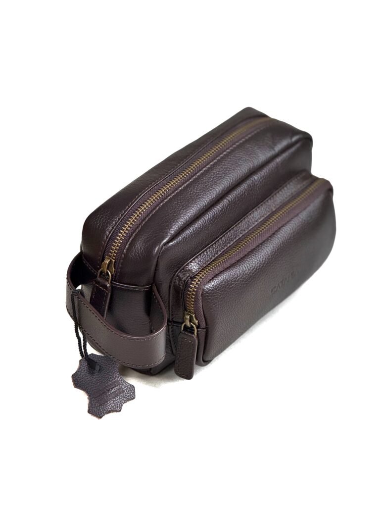 This leather toiletry kit is designed for practical and organized travel use. Crafted from 100% soft milled leather, it offers durability with a refined finish suitable for daily and travel needs. The waterproof inner lining protects your essentials from spills and moisture, ensuring safe storage of toiletries and grooming items. The design features a spacious main compartment, an exterior front pocket for quick access, and internal zip and slip pockets for organized storage of smaller items. Finished with high-quality YKK zippers, it delivers smooth functionality and reliable performance in a compact and travel-friendly form.