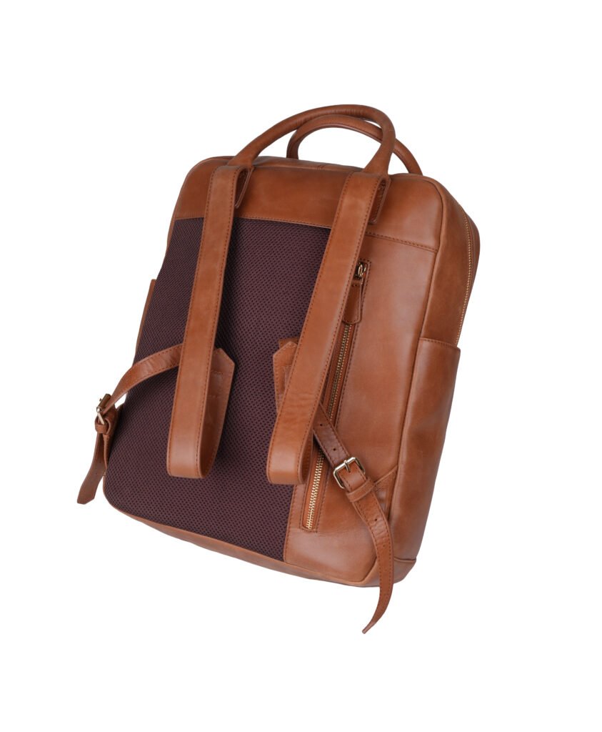 Crafted from premium plain Nappa leather in Cognac Tan, this elegant backpack features twill fabric lining, golden YKK zippers, nickel-free gold-finish fittings, adjustable leather shoulder straps (drop: 65 cm), and sturdy leather handles—blending luxury with everyday function.