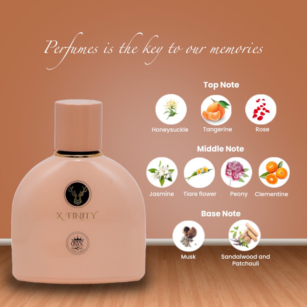 * Opening with vibrant top notes of citrus and bergamot, X Finity for Women evolves into a floral bouquet of jasmine and rose, creating a delicate yet captivating aura.